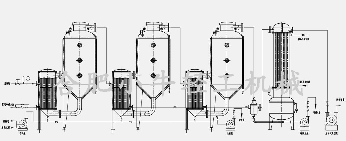 三效外循環(huán)蒸發(fā)器主要組成部件有第一效加熱器、第二效加熱器、第三效加熱器、第一效分離器、第二效分離器、第三效分離器、冷凝器、冷凝水罐、真空泵、料液泵、閥門管路系統(tǒng)、電控系統(tǒng)等。設(shè)備在運(yùn)行時(shí),料液通過泵送或真空自吸原理進(jìn)入各效加熱器及各效分離器的管程,加熱介質(zhì)(鍋爐蒸汽)進(jìn)入第一效加熱器的殼程,料液在真空狀態(tài)下沸點(diǎn)降低,當(dāng)受熱到一定溫度后開始沸騰,并從噴射管噴入分離器,進(jìn)行快速蒸發(fā)和汽液分離,未被蒸發(fā)的料液從底部循環(huán)管回流到加熱器再次噴入分離器,形成循環(huán)。由一效加熱器產(chǎn)生的二次蒸汽進(jìn)入二效加熱器殼程,作為第二效加熱器的加熱介質(zhì),同理第二效的二次蒸汽作為第三效加熱器的加熱介質(zhì),熱能得到充分利用,從而實(shí)現(xiàn)節(jié)能效果。最后的蒸汽進(jìn)入冷凝器,被冷卻循環(huán)水換熱冷凝成液相,進(jìn)入冷凝水收集罐,最后排出。第二效、第三效的物料運(yùn)動(dòng)狀態(tài)與第一效同理,當(dāng)料液縮到一定的程度,經(jīng)取樣確定合格后即可出料,完成蒸發(fā)濃縮過程。